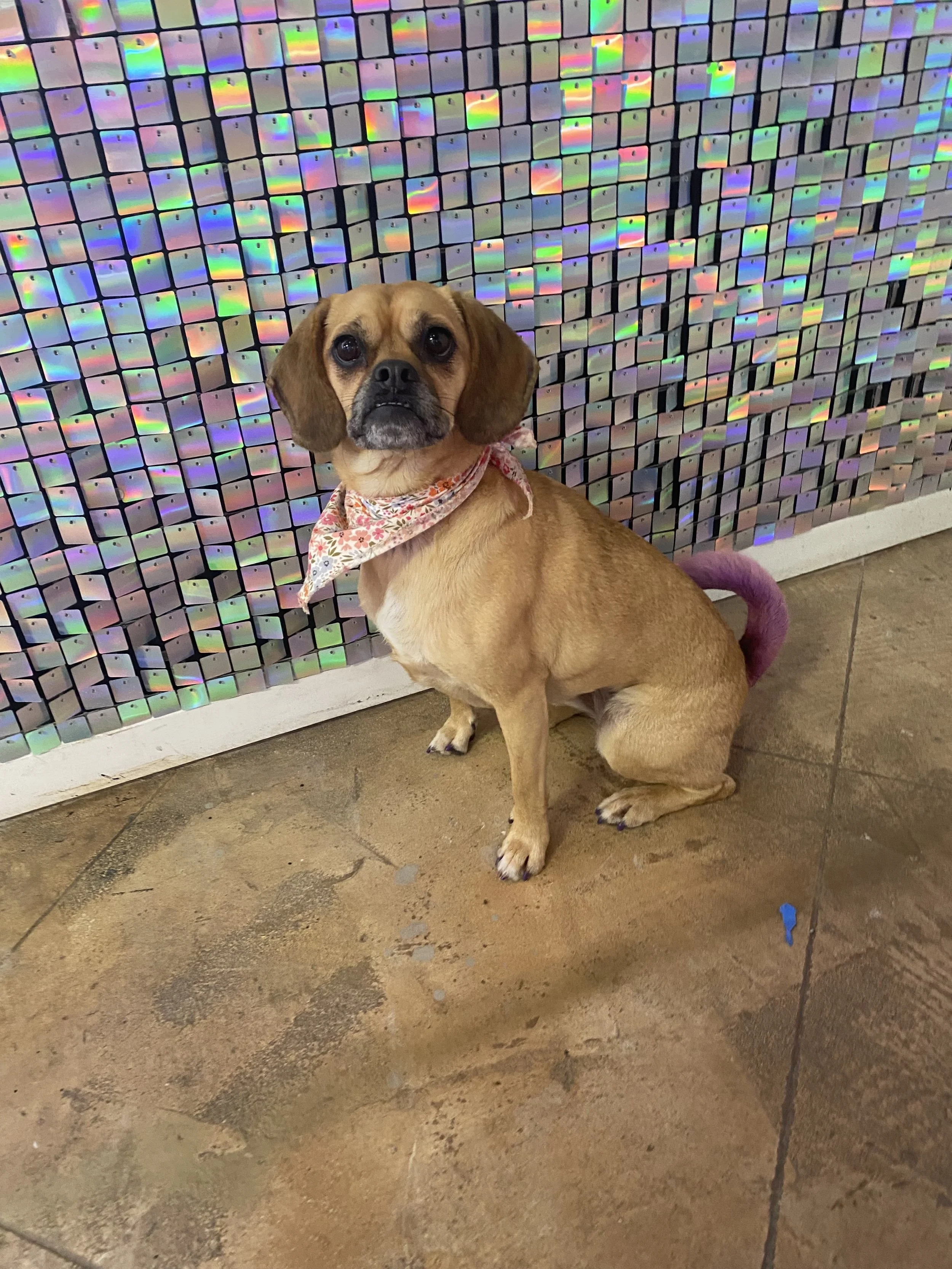 Harmony is a 6 year old puggle. But don’t let that innocent face fool you, she is a total diva! She walks around with her sassy attitude and stylish bandanas. She will happily preform all of her tricks for you but only when there is treats involved!